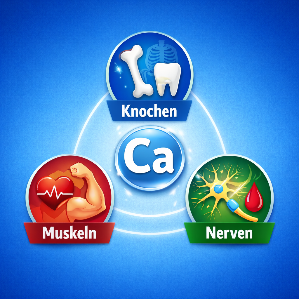 Calcium ist der zentrale Baustoff für Knochen und Zähne. Ohne ausreichende Zufuhr sinkt die Knochendichte → erhöhtes Risiko für Osteoporose und Knochenbrüche. - Muskelfunktion (inkl. Herz)